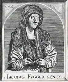 The founder of the family was Johann Fugger, a weaver at Graben, near the Swabian Free City of Augsburg.[1] The last name was originally spelled "Fucker" – the first recorded reference to the family comes when Johann's son, also named Johann (or Hans), moves to Augsburg in 1367, with the local tax register laconically noting Fucker advenit, "Fugger has arrived".[2][3] He married Klara Widolf and became an Augsburg citizen. After Klara's death, he married Elizabeth Gattermann. He joined the weaver's guild, and by 1396 he was ranked high in the list of taxpayers. He added the business of a merchant to that of a weaver.[1]