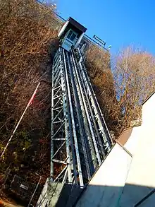 The Old Quebec Funicular (French: Funiculaire du Vieux-Québec) is a funicular railway in the Old Quebec neighbourhood of Quebec City, Quebec, Canada. It links the Haute-Ville (Upper Town) at Dufferin Terrace to the Basse-Ville (Lower Town) at Rue du Petit-Champlain. The Basse-Ville includes such sites as the colonial-era Notre Dame des Victoires church, the historic Petit Champlain district, the port, and the Musée de la civilisation (Museum of Civilization). Climbing at a 45-degree angle, the railway covers a total distance of 64 metres (210 ft).[1]