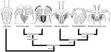 With its unusual anatomy, Furca has a colorful taxonomic history. The first specimens were discovered by Joachim Barrande, who named them Furca bohemica (Latin for "Bohemian fork") but did not formally publish descriptions. The specimens were not illustrated until 1847, when they were interpreted as the hypostome of the trilobite Prionocheilus. Antonin Fritsch was the first to formally describe Furca as a distinct taxon, interpreting F. bohemica as a larval echinoderm in 1908.[3][4] In 1919, F. bohemica was, for the first time, interpreted as an arthropod. A second species, F. pilosa was described in 1999, as well as an unnamed species simply called "Furca sp.". In 2013, Rak and colleagues suggested that F. pilosa and all previously named species were synonyms of Furca bohemica.[2]