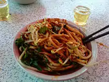 - Tian San Juan Mo (田三卷膜): a type of pancake wrapped in the shape of a cone, stuffed with bean sprouts, tofu, and other ingredients, with sauce on top.[23]