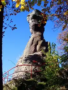 The Gänseschnabel is a natural monument north of Ilfeld in Thuringia, Germany. It is a striking, free-standing rock pillar made of porphyry, which resembles the beak of a goose (or duck) and from which there is a comprehensive view of the Behre valley looking towards Netzkater.