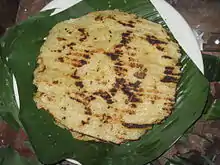 A güirila is a sweet type of tortilla made from young white maize.[1] They are usually eaten with crema (sweet or sour cream) and cuajada, a type of salty Nicaraguan crumbled white cheese.