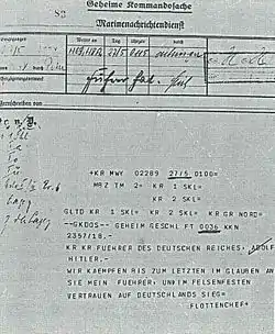 Following this meeting, Lütjens confided to Vizeadmiral Hans-Erich Voss, then working at Raeder's headquarters, that "survival was improbable", and bade him farewell.[61][lower-alpha 3]