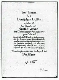Ten days later Lütjens was given command of the fleet on a temporary basis. Raeder regarded Lütjens as a sound tactician, excellent staff officer and a leader with all-important operational and battle experience. After the war Raeder was candid about his decision to elevate Lütjens through the chain of command. Raeder said of his progression, "He had also experience in staff work, and as my Chief of Personnel he had won by special confidence in years of close association."[31] Raeder expressed his confidence that Lütjens displayed wise judgment and was unlikely to act rashly. When at sea, he allowed him to take command of the situation and make operational decisions at his own discretion.[32] Although described as reserved and unapproachable toward subordinates, he was held to be "of manifest integrity and reliability."[33] Hitler expressed his gratitude to Lütjens for "preparing and leading the Navy into action", and awarded him the Knight's Cross of the Iron Cross on 14 June 1940.[34]