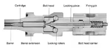 The G3 is a selective-fire automatic weapon that employs a roller-delayed blowback operating system. The two-piece bolt assembly consists of a breech (bolt head) and bolt carrier. The bolt is held in battery by two sliding cylindrical rollers that engage locking recesses in the barrel extension. The breech is opened when both rollers are compressed inward against camming surfaces driven by the rearward pressure of the expanding gases upon the bolt head. As the rollers move inward, recoil energy is transferred to the locking piece and bolt carrier which begin to withdraw while the bolt head slowly moves rearward in relation to the bolt carrier. As the bolt carrier clears the rollers, pressure in the bore drops to a safe level, the bolt head is caught by the bolt carrier and moves to the rear as one unit, continuing the operating cycle. Based on the geometric relationship arising from the angles of the roller contact surfaces of the locking piece and the barrel extension recesses, the recoil of the bolt head is delayed by a ratio of 4:1 for the 7.62×51mm NATO chambering. Thus during the same period of time, the bolt head carrier moves 4 times faster than the bolt head. This ratio is continued until the locking rollers have been withdrawn from the barrel extension recesses. The bolt features an anti-bounce mechanism that prevents the bolt from bouncing off the barrel's breech surface. The "bolt head locking lever" is a spring-loaded claw mounted on the bolt carrier that grabs the bolt head as the bolt carrier group goes into battery. The lever essentially ratchets into place with friction, providing enough resistance to being re-opened that the bolt carrier does not rebound. The spring-powered claw extractor is also contained inside the bolt while the lever ejector is located inside the trigger housing (actuated by the recoiling bolt).[6]