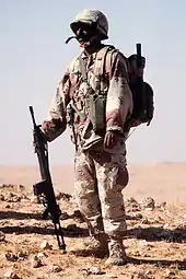 Initial production G3 rifles differed substantially from more recent models; early rifles featured closed-type mechanical flip-up sights (with two apertures), a lightweight folding bipod, a stamped sheet steel handguard, a wooden buttstock (in fixed stock models) or a telescopic metal stock.[6] Before delivery to the Bundeswehr, each G3 went through functional checks, zeroing the sight line (Anschießen) and a shooting test at the factory. In the process, five shots were fired at a target at 100 metres (109 yd) with particularly accurate sighting-in ammunition. The 5-shot group could not exceed 120 mm (4.7 in) (1.2 mil/4.13 MOA) diameter. The weapon was modernized during its service life (among other minor modifications it received new sights, a different flash suppressor, and a synthetic handguard and shoulder stock), resulting in the most recent production models, the G3A3 (with a fixed polymer stock) and the G3A4 (telescoping metal stock). The rifle proved successful in the export market, being adopted by the armed forces of over 40 countries.[6] Of that figure, 18 countries undertook domestic production of the G3 under license.[8] Known manufacturers of the weapon included France (MAS), Greece (Hellenic Arms Industry), Iran (Defense Industries Organization), Luxembourg (Luxemburg Defense Technologie), Mexico, Myanmar, Norway (Kongsberg Våpenfabrikk), Pakistan (Pakistan Ordnance Factories), Portugal (FBP), Saudi Arabia (Military Industries Corporation (Saudi Arabia)), Sweden (Husqvarna Vapenfabrik AB and FFV Carl-Gustaf in Eskilstuna), Thailand, Turkey (MKEK) and the United Kingdom (Royal Ordnance).[6]