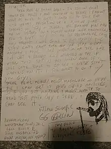 Another attraction to Allin performances was his continual threats of suicide. In 1989, Allin wrote to Maximum RocknRoll stating that he would commit suicide on stage on Halloween 1989. However, he was in jail when that day came. He continued his threat each following year but ended up imprisoned each following Halloween. When asked why he did not follow through with his threats, Allin stated, "With GG, you don't get what you expect—you get what you deserve."[23] He also stated that suicide should only be done when one had reached one's peak, meeting the afterlife at one's strongest point and not at one's weakest.[24]