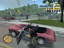 Grand Theft Auto clones allow players to freely explore the game world,[6] which is typically on the scale of an entire city. Some games base their level design on real world cities, such as London, New York City, and Los Angeles.[6] Players are usually able to navigate by vehicle or on foot.[29][30] Some games put greater emphasis on leaping, climbing,[6] and even swimming.[31] Exploring the world is not just necessary to complete objectives, but also to gain valuable items, weapons, and vehicles. Different parts of the game world may be controlled by different enemy factions, who will attempt to stop the player in a variety of ways.[17] However, more recent games in this genre allow players to acquire their own territory.[8][32] The freedom of navigating a huge game world may be overwhelming or confusing for new players.[17] Game designers have come up with a variety of navigational aids to solve this problem. A mini-map feature is common,[33] while Saints Row and Grand Theft Auto IV go so far as to offer a GPS service.[25] Games without these navigation tools are sometimes criticized as confusing.[6]
