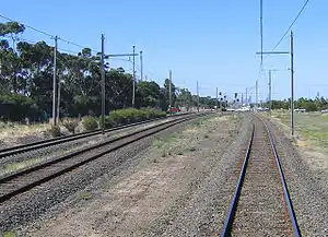![]() Station site looking towards Melbourne, showing the track slew to accommodate the island platform. The third track on the left is the interstate standard gauge line which was not constructed until ten years after Galvin closed. | |||||||||||||||||||||