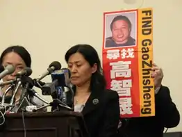 Gao's memoir, A China More Just (2007), documents his "fight as a rights lawyer in the world's largest communist state."[4] In subsequent writing, he accuses the ruling Communist Party of China of state-sponsored torture and reports having been tortured by the Chinese secret police. He disappeared in February 2009. At the beginning of 2012, Gao's brother said he had received a court document saying his brother was in Shayar jail in Xinjiang.[5] In 2014, it was reported that Zhisheng was released from jail and put under house arrest. He disappeared again in August 2017 in an apparent attempt to escape house arrest and was subsequently taken back into custody on his recapture in September.[6]