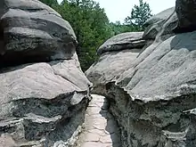 The morphology of Garden of the Gods is much steeper and rockier than in much of Illinois. Comparatively dramatic erosion patterns have created hoodoos and other unusual sandstone formations, as well as scenic overlooks such as Buzzards Point from which raptors, scavenger birds, and humans can look out over the Shawnee National Forest.[1][2] Several of the hoodoos have evocative names, including Anvil Rock, Camel Rock, and Table Rock.[3]