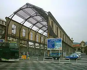 The first phase of the project, the internal and external renovation of the station building, took place in 2013. Work was completed by December of that year and the building was re-opened on 4 January 2014. The new Raoul Mille library has been incorporated into the station's former waiting room and the building now houses multimedia rooms, meeting rooms and a climate-controlled storage basement.[2] The second phase of the project involved the restoration of the train shed site. Plans were drawn up for a shopping centre, cinema, sports facilities, housing and underground car park,[5] and the return of Gustave Eiffel's listed train shed.[6] The plans were initially opposed by councillor Jean Claude Mari. However, he dropped legal proceedings in November 2014, allowing the city of Nice and the developers to begin work. The underground car park had been completed by the middle of 2016 and it was anticipated at that time that the renovation of the former train shed would be completed by 2017 with other facilities expected to open during the second quarter of 2018. The project won the Pyramide d'or, the highest award of the Fédération des Promoters Immobilisers in 2016.[7][8] In March 2018, during ongoing redevelopment work, the main hall was temporarily opened to the public to house an exhibition by the Salon du Vintage.[9] On 10 May 2019 it was confirmed that the hall's inauguration was scheduled for 17 May 2019 with its public opening on the next day.[10] The restored train shed houses a food court with businesses selling food from the local region. A mezzanine at each end is linked to the ground floor by a wide staircase. Plans remain for the addition of a nightclub, fitness center, cultural center and offices.[1]