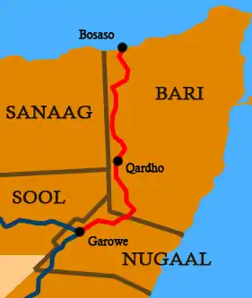 In the Bari province, the highway starts from the Port of Bosaso and continues south as a single carriageway, up over the Al-Miskat hills and downwards toward Qardho. It continues from there around 205 km (127.6 mi) southwards to Garowe, whereafter the thoroughfare joins the Mogadishu–Berbera highway in neighbouring Somaliland.