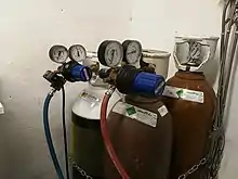 - Mixing by partial pressure: a measured pressure of oxygen is decanted into the cylinder and cylinder is "topped up" with air from the diving air compressor. For mixtures with oxygen fraction of 40% or more, the delivered air quality must be suited for oxygen service. This is usually achieved by using a suitable grade of oil and an extra in-line filter (hyperfilter} to reduce the residual oil contamination in the compressed air to the more stringent requirements for blending with high oxygen partial pressure gases. Cylinders used for partial pressure blending and for mixtures with oxygen fraction greater than 40% are required by law in some countries to be cleaned for oxygen service. In South Africa, a cylinder to be used for mixes with a high partial pressure of oxygen must be cleaned before being put into that service.[10]