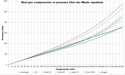 At pressures above about 200 bar the compression of gases begins to deviate from the ideal gas laws, and consequently partial pressure blending must take into account that the gases added at higher pressure will provide lower volumetric proportion than gases added at lower pressure, and these deviations from linearity will vary according to the gas. Calculations for high pressure partial pressure blends may require use of the Van der Waals equation. This does not affect premixed gases, which will retain their mix ratio at any pressure, so continuous blending is not affected by this problem.