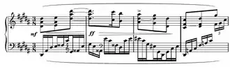 This piece contains technical challenges for the right hand such as the fast repetition of three-note chords in the opening accompaniment, the double note passages beginning at bar 57, and the disjunct climactic movement of the hands beginning at bar 66.[6]