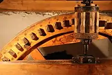 The segmental gear, which receives/communicates reciprocating motion from/to a cogwheel, consisting of a sector of a circular gear/ring having cogs on the periphery,[8] was invented by Arab engineer Al-Jazari in 1206.[9] The worm gear was invented in the Indian subcontinent, for use in roller cotton gins, some time during the 13th–14th centuries.[10] Differential gears may have been used in some of the Chinese south-pointing chariots,[11] but the first verifiable use of differential gears was by the British clock maker Joseph Williamson in 1720.