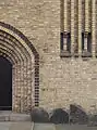 With its yellow brickwork and vertical ornamentation resembling organ pipes, the exterior bears similarities to Jensen-Klint's later and much more famous work, Grundtvig's Church in Copenhagen. But this does not extend to the inside which is dominated by the imposing timber structure of the roof which looks like an inverted ship's hull, reflecting the town's nautical traditions as a port and important ferry terminal. The ribs work as supporting columns. The most striking ornamentation of the interior is the fresco in the demi-domal vault above the choir. When the church was completed, there were no funds for a painting but by 1924, public collections and gifts had provided the necessary means. On Jensen-Klint's recommendation, a still young Elof Riseby was charged with the assignment. The fresco is inspired by John 3:16: For God so loved the world that He gave His only begotten Son.