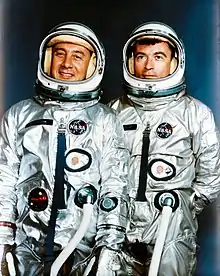 ![]() Astronauts John Young and Gus Grissom walk up the ramp leading to the elevator that will carry them to the spacecraft for the first crewed Gemini mission | |