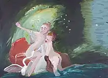 Figgis painted a version of Leda and the Swan in 2018 after an earlier work by François Boucher. Figgis’ contemporary version reinvents an idyllic romantic scene of lavish playfulness with a dark humor creating a scene of profanity and horror.[14][7][15]