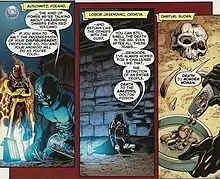 At some point in the future, Ares steals the dead body of Wonder Woman.[2] He comes back through time and manipulates Dr. Barbara Minerva, the power behind the Secret Society of Super Villains, and Dr. T.O. Morrow to gather a team of scientists to collect soil samples from various regions of Earth where acts of genocide took place over the past 100 years ranging from 1908 to 2008.[3] The scientists, with the magical help of Felix Faust, use the soil to further empower the corpse of Wonder Woman with the evil energy of death and destruction. The result is the creation of the sadistic monster Genocide, brought to life through a combination of science and magic. T.O. Morrow believed Genocide was too unstable to be let loose, and pleaded with Minerva to terminate the project. Further validating his point, Genocide even attacked her fellow team member Phobia, nearly killing her. Despite this, Morrow's words of caution were completely ignored.[4]