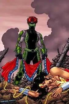 ![]() Genocide standing behind a defeated Wonder Woman as seen on the cover to Wonder Woman vol. 3 #26. | |