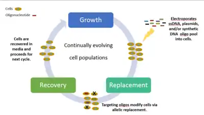 Chemically combined, synthetic single-stranded DNA (ssDNA) and a pool of oligionucleotides are introduced at targeted areas of the cell thereby creating genetic modifications. The cyclical process involves transformation of ssDNA (by electroporation) followed by outgrowth, during which bacteriophage homologous recombination proteins mediate annealing of ssDNAs to their genomic targets. Experiments targeting selective phenotypic markers are screened and identified by plating the cells on differential medias. Each cycle ultimately takes 2.5 hours to process, with additional time required to grow isogenic cultures and characterize mutations. By iteratively introducing libraries of mutagenic ssDNAs targeting multiple sites, MAGE can generate combinatorial genetic diversity in a cell population. There can be up to 50 genome edits, from single nucleotide base pairs to whole genome or gene networks simultaneously with results in a matter of days.[45]