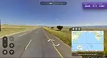 The game's HUD primarily features the Google Street View imagery, as well as a compass. Users can control the movement, panning, and zooming of the image, although Geoguessr allows any of these features to be disabled for harder gameplay.[8] An inset map, using Google Maps's standard overlay, allows players to place a pin to make their guess.