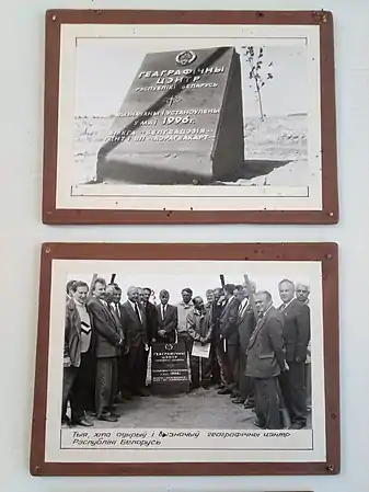 Search works were carried out in 1996[3] by the 82nd expedition association "Belgeodesy" in cooperation with the firm "Aerogeokart" a special program using the 1:200 000 maps and satellites to find the geographic center of Belarus.