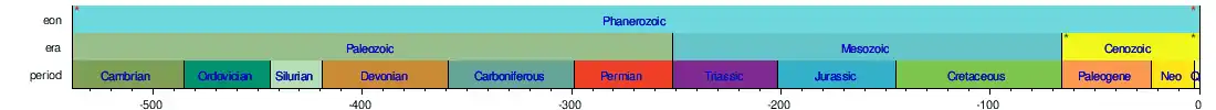 - 541 ± 0.3 Ma: Cambrian explosion – vast multiplication of hard-bodied life; first abundant fossils; start of the Paleozoic