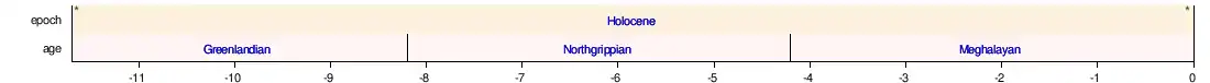 The geological time scale encompasses the history of the Earth.[10] It is bracketed at the earliest by the dates of the first Solar System material at 4.567 Ga[11] (or 4.567 billion years ago) and the formation of the Earth at 4.54 Ga[12][13] (4.54 billion years), which is the beginning of the informally recognized Hadean eon – a division of geological time. At the later end of the scale, it is marked by the present day (in the Holocene epoch).