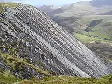 Examples of mass movement are not common in Snowdonia but there is a concentration along the glacially excavated Bala lineament through Talyllyn. The largest is that which originates on the steep northwest slopes of Graig Goch and which has resulted in a mass of debris up to 30m high covering the otherwise flat floor of this trough and behind which is the lake.[14] There are further smaller examples which form Bwlch Cyfyng southwest of Abergynolwyn and on the southeastern slopes of Mynydd Gwerngraig east of Cadair Idris. A further mass of slipped material is recorded beneath the peak of Pen yr Helgi Du at the head of Cwm Eigiau.[15]