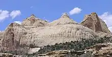 In Mid Jurassic time gypsum, sand, and limey silt were deposited in what may have been a graben that was periodically covered by sea water and thus a place where repeated flooding was followed by evaporation.[13] The resulting Carmel Formation is composed of 200 to 1,000 feet (60 to 300 m) of reddish-brown siltstone, mudstone and sandstone that alternates with whitish-gray gypsum and fossil-rich limestone in a banded pattern. Fossils include marine bivalves and ammonites.[14] Most of the Carmel has been removed from the Waterpocket Fold's crest but outcrops can be seen capping the Golden Throne and atop various domes in the area. It can also be seen as reddish-brown triangular-shaped spurs called 'flatirons' that form the Waterpocket Fold's eastern rampart.