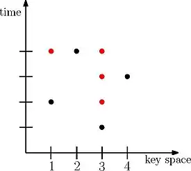 In the geometric view of the online binary search tree problem, an access sequence (sequence of searches performed on a binary search tree (BST) with a key set ) is mapped to the set of points , where the X-axis represents the key space and the Y-axis represents time; to which a set of touched nodes is added. By touched nodes we mean the following. Consider a BST access algorithm with a single pointer to a node in the tree. At the beginning of an access to a given key , this pointer is initialized to the root of the tree. Whenever the pointer moves to or is initialized to a node, we say that the node is touched.[2] We represent a BST algorithm for a given input sequence by drawing a point for each item that gets touched.