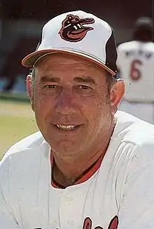 George Irvin Bamberger (August 1, 1923 – April 4, 2004) was an American professional baseball player, pitching coach and manager. In Major League Baseball, the right-handed pitcher appeared in ten games, nine in relief, for the 1951–52 New York Giants and the 1959 Baltimore Orioles. He later spent ten seasons (1968–77) as the Orioles' pitching coach and managed the Milwaukee Brewers (1978–80; 1985–86) and New York Mets (1982–83).[1][2] During his playing career, he threw and batted right-handed, stood 6 feet (1.8 m) tall and weighed 175 pounds (79 kg).