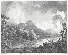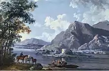 A gouache view of Ullswater in the National Gallery of Ireland, was used for an engraving by Samuel Middiman for Select Views in Great Britain. Middiman describes the view of the bold promontory of Hollin Fell, in the centre, taken from Soulby Fell, with: 'the vast chaos of mountains that guard the Head of the lake beyond. Barret has included an elegant group of figures enjoying a picnic on Soulby-Fell on the right of the composition; a ferry transports more tourists and their horses across the lake to the base of this hill.[3][47]