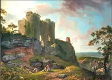 George Barret produced a notable series of paintings of scenery in Wales, some of which have considerable similarity to views by Richard Wilson. A few of these paintings may have been completed shortly after his arrival in England. An oil-painting of Hawarden Castle in Flintshire was exhibited by Barret at the Society of Artists in Great Britain in 1765.[38] However, it seems likely that most of Barret's Welsh paintings were produced towards the end of his life. In the mid-1770s Wales was becoming an increasingly popular destination for wealthy tourists.