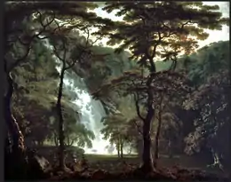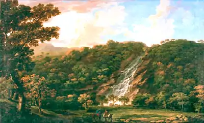 Following work for Samuel Madden and the Earl of Milltown, Barret started to produce paintings of Irish landscapes. These portrayed the actual landscape and not capriccio scenery. This was a natural progression from his previous idealised Italianate scenery. Barret is particularly associated with Edward Wingfield who in 1751 became Viscount Powerscourt.[10] Wingfield owned Powerscourt House and extensive estates to the south of Dublin in County Wicklow. These included the scenic river Dargle with its craggy red rocks and impressive Powerscourt Waterfall that is the second highest in Ireland. Scenery on the Dargle often figures in Barret's surviving oil paintings and he also painted at Avoca in the south of County Wicklow.[11] A View of Powerscourt House under the Sugar Loaf Mountain is now at the Yale Center for British Art, and a version of Barret's Powerscourt Waterfall is in the National Gallery of Ireland.[12]