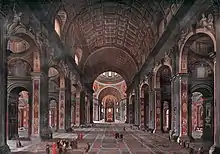 In 1844 in New Orleans, Cooke started what would become his most important professional relationship when he met Alabama industrialist Daniel Pratt. Pratt was immediately drawn to Cooke's work, and decided to give the artist two floors in one of his warehouses for Cooke to use as a gallery and studio.[3] After a few years, Pratt decided to take the unusual step of adding a separate gallery to his home in Prattville, Alabama, solely to house Cooke's art. Pratt also commissioned Cooke to paint what would become his best known work, the Interior of St. Peter's Rome, a giant painting based on a smaller piece that Cooke had previously painted during his travels in Europe.[3] In 1867, Pratt donated Interior of St. Peter's Rome to the University of Georgia, where it still hangs today in the University's chapel. At 17 by 23.5 feet, the work was said to be the largest framed oil painting in the world at the time of its donation,[5] and it still ranks among the world's largest.[3]