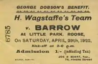 George Dobson's Testimonial match at Barrow took place against a Harold Wagstaff Select XIII team at Little Park, Roose, Barrow-in-Furness on Saturday 29 April 1922.