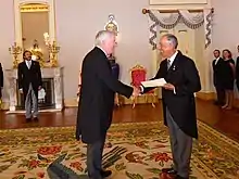 In 2017, George Glass was nominated by President Donald Trump[3] to become Ambassador Extraordinary and Plenipotentiary of the United States of America to the Republic of Portugal. The United States Senate confirmed his nomination[4] on August 3, 2017.[5] He presented his credentials to the President of the Portuguese Republic, Marcelo Rebelo de Sousa, on August 25, 2017.[6]