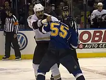 On July 5, 2013, after one season with the Panthers, Parros was traded to the Montreal Canadiens for Philippe Lefebvre and a 7th round draft pick in 2014.[8] In the season opener against the Toronto Maple Leafs on October 1, 2013, Parros engaged in a fight with Colton Orr in the third period. Parros lost his balance and fell headfirst to the ice knocking him out. Orr expressed immediate concern waving for training staff to make their way to Parros as he lay on the ice motionless. Parros was taken off on a stretcher with a concussion.[9] Parros missed the next twelve games as a result of his injuries. This incident touched off renewed debate regarding fighting's place in the National Hockey League and player safety moving forward.[10][11] After returning to play, Parros sustained a second concussion on December 14, 2013, following a fight with Eric Boulton during a game against the New York Islanders.[12] Parros next played on January 11, 2014, in a game against the Chicago Blackhawks. However, he saw limited action during the season, either because of injury or because of being a healthy scratch, and appeared in only 22 games in total.