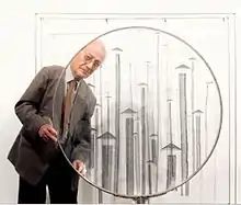 In 1973 Zongolopoulos created a 10 metres height sculpture under the name Diaphragm or Panels of Merlin which was placed the same year in Kolonaki, Athens, at the headquarters of a major insurance company.[15] The same period (1970s) Zongolopoulos created a series of artworks (like The Gifts, The Egg, Lens & Nest, etc.) with symbolic content using magnifying lenses in order to achieve visual tricks.[3]