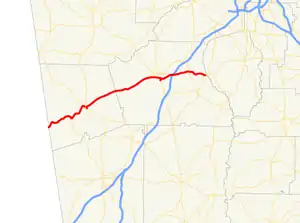 | Alabama state line | 0.0 | 0.0 | Western terminus at the Alabama state line; roadway continues as SR 22 west towards Roanoke, Alabama. | ||
