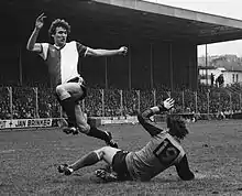 Gerard van der Lem and goalkeeper Nijhuis, 22 April 1979. Vitesse Arnhem-Feyenoord Rotterdam 1-1. Feyenoord finished 2nd in the Dutch league in the 1978/79-season, with 62 goals for and 19 goals against (goaldifference +43).