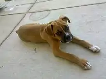 Boxers were originally a docked and cropped breed, and this is still done in some countries,[9] but due to pressure from veterinary associations, animal rights groups, and the general public, both cropping of the ears and docking of the tail have been prohibited in many countries around the world, and is not recognised by the breed standard laid down by The Kennel Club of the UK. The American Kennel club still permits cropped ears. A line of naturally short-tailed (bobtail) Boxers was developed in the United Kingdom in anticipation of a tail-docking ban there;[10] after several generations of controlled breeding, these dogs were accepted in the Kennel Club (UK) registry in 1998, and today representatives of the bobtail line can be found in many countries. In 2008, the Fédération Cynologique Internationale (FCI) added a "naturally stumpy tail" as a disqualifying fault in their breed standard, meaning those Boxers born with a bobtail can no longer be shown in FCI member countries. In the United States and Canada as of 2012, cropped ears are still more common in show dogs, though the practice of cosmetic cropping is currently opposed by the American Veterinary Medical Association.[11] In March 2005, the AKC breed standard was changed to include a description of the uncropped ear, but to severely penalize an undocked tail. The tail of a boxer is typically docked before the cartilage is fully formed, from 3–5 days old.[12] The procedure does not require any sutures when performed at this young age, and anesthesia is not used. The docking of the tail is not permitted under the breed standard of The Kennel Club UK.