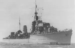 ZH1 had an overall length of 106.7 metres (350 ft 1 in) and was 105.2 metres (345 ft 2 in) long at the waterline. The ship had a beam of 10.6 metres (34 ft 9 in), and a maximum draught of 3.52 metres (11 ft 7 in). She displaced 1,604 long tons (1,630 t) at standard load and 2,228 long tons (2,264 t) at deep load. The two geared steam turbine sets, each driving one propeller shaft, were designed to produce 45,000 shaft horsepower (34,000 kW) using steam provided by six water-tube boilers for a designed speed of 36 knots (67 km/h; 41 mph).[2] ZH1 reached 37.5 knots (69.5 km/h; 43.2 mph) from 53,000 shp (40,000 kW) during her sea trials.[3] The ship carried a maximum of 520 tonnes (512 long tons) of fuel oil which gave a range of 2,700 nautical miles (5,000 km; 3,100 mi) at 19 knots (35 km/h; 22 mph). Her crew consisted of 12 officers and 218 sailors.[2]