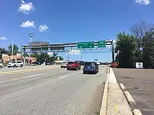 Upon crossing Arch Road, Germantown Pike enters Plymouth Township and becomes a four-lane undivided road, heading southeast through suburban residential areas, passing through the community of Plymouth Valley. The road turns south and then southeast as it passes homes and some commercial establishments, becoming a four-lane divided highway as it comes to an intersection with Sandy Hill Road to the southwest of Villanova Ballpark at Plymouth. At this point, Germantown Pike becomes State Route 3053 (SR 3053), an unsigned quadrant route. Germantown Pike turns into a five-lane road with a center left-turn lane and heads south through commercial areas. Past the Hickory Road intersection, the road becomes a six-lane divided highway and passes businesses as it heads to the west of the Plymouth Meeting Mall. Germantown Pike crosses Plymouth Road in the community of Hickorytown and reaches the Mid-County Interchange, where it comes to the Norristown interchange with the Pennsylvania Turnpike (Interstate 276, I-276) that also provides access to northbound I-476 (Pennsylvania Turnpike Northeast Extension) before a partial interchange with I-476 that provides access to southbound I-476 and access from northbound I-476. Following this, Germantown Pike becomes a four-lane divided highway and passes under Norfolk Southern's Morrisville Line before it heads into commercial areas, narrowing to a two-lane undivided road at the Chemical Road intersection. The road turns southeast and comes to an offset junction with Butler Pike in the community of Plymouth Meeting. Past here, Germantown Pike heads into Whitemarsh Township and runs through suburban residential areas with some businesses, passing southwest of Plymouth-Whitemarsh High School before heading to the northeast of a golf course. The road crosses Joshua Road in the community of Lafayette Hill and continues past a mix of homes and businesses. Germantown Pike makes a turn to the east at the Church Road intersection and heads through wooded residential areas, crossing into Springfield Township and curving southeast after passing south of a golf course.[4][5]