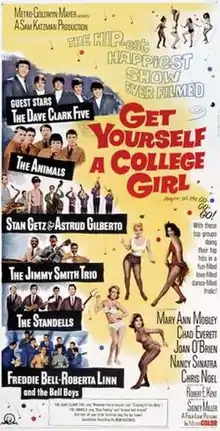 Get Yourself a College Girl, also released as The Swingin' Set, is a 1964 Metrocolor film comedy in the style of a beach party movie. The plot involves a college co-ed who tries to balance her time writing songs and dealing with her publisher who tries to pursue her. It was directed by Sidney Miller and written by Robert E. Kent, and filmed at Sun Valley, Idaho, United States.[2]