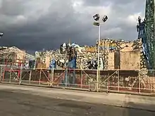 In its heyday, the exterior of the ride was painted in graffiti-style imagery and two animated figures, a devil stirring a pot and a large growling demon. At one time, a morass of three serpents was another animated figure on the front of the ride,[2] and other animated figures have been there previously. The serpents were absent for the first part of the 2007 season, though they later returned in greater quantity, though the two on the right come too close together, rubbing off the foam rubber eye of the rightmost serpent. A greenish vulture was also added to the leftmost window. In front of the ride, a glass case held an animatronic figure who simultaneously vomits and defecates while hunched over a toilet.[3] The ride's cars were like bumper cars, but were in multiple colors and have heavier protective guards that are lowered over riders. After April 2009, two virtually identical vultures were places on the exterior of the ride, the serpents are again removed, and the vomiter/defecator was given a female likeness, including a long blonde wig and a black skirt.
